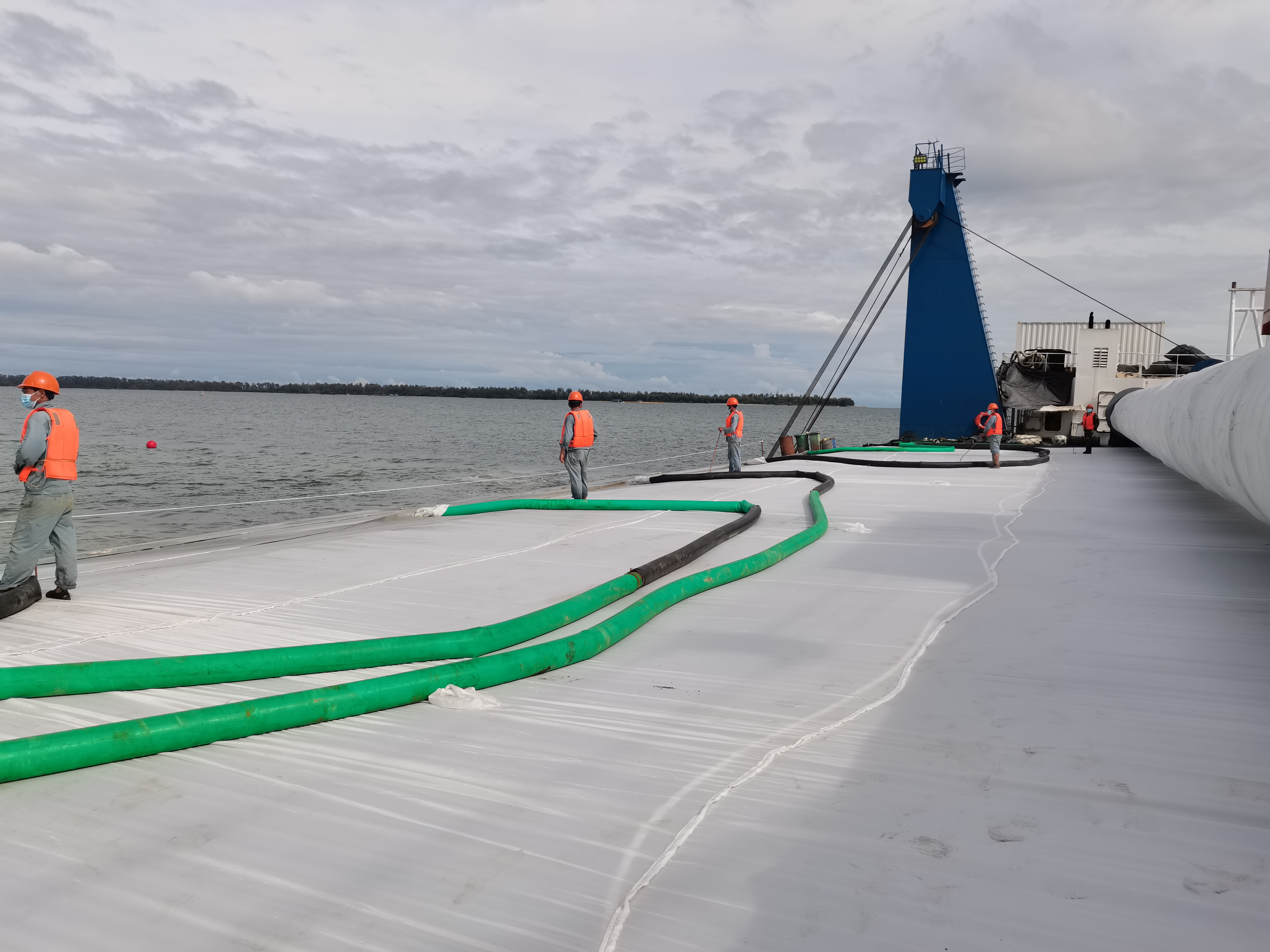 2021年8月21日,隨著本工程NTM(相當于國內的水上水下施工許可證,由海事局批發)的獲取,本工程的所有外部手續全部獲批,標志著本工程的正式開工。截至2021年10月15日,我們已完成北側堤、東側堤及火炬區所有區域約19.5萬m³砂墊層的鋪設,北側堤樁號B5+716~B6+014、東側堤樁號D0+000~D2+019塑料排水板的插設,北側堤樁號B5+731~B6+014、東側堤樁號D0+000~D1+708砂肋軟體排的鋪設,以及東堤D0+000~D1+319段水下一層袋裝砂的施工,已完成M1區吹填約110萬m³。