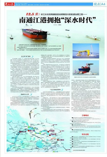 如果說長江口12.5米深水航道的打通稱得上是長江“龍昂首”,那么,12.5米深水航道向南京延伸則稱得上是“龍挺胸”。幾年后,南通沿江港區(qū)將迎來長江下游12.5米深水航道溯江而上的“深水時代”。